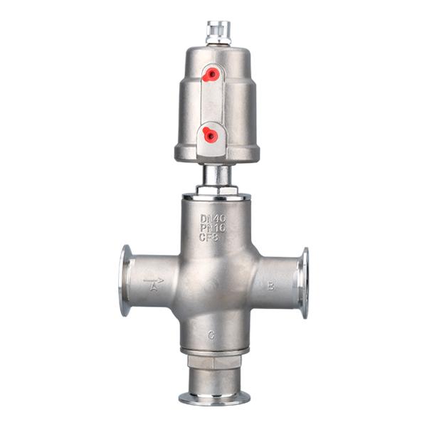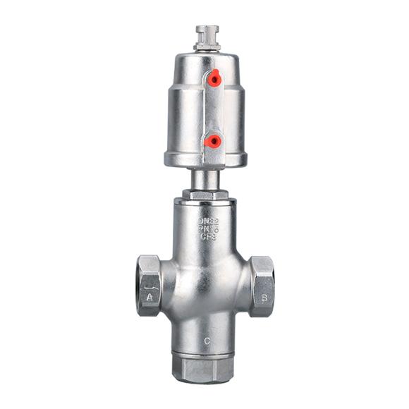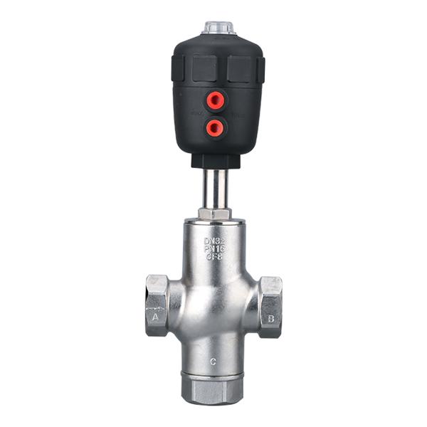 氣動三通角座閥由氣動執行器和三通結構閥體組成,共有三處通孔,主要作用是實現介質的換向、分流、或混合功能。連接方式有螺紋、卡箍、法蘭等可根據現場需求選擇。